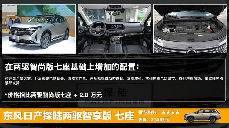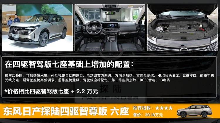 与两驱智享版七座相比,四驱智驾版七座在配置上增加了适时四驱系统、车道偏离预警系统、主动安全系统、疲劳驾驶提示、前方配装预警、后方碰撞预警、移动物体预警系统、越野模式、陡坡缓降、前泊车雷达、360度全景影像、全速自适应巡航、ProPILOT辅助驾驶系统、倒车车侧预警系统、并线辅助、车道保持辅助系统、车道居中保持、道路交通标识识别、车顶行李架、自适应远近光、多色车内氛围灯、255/50 R20轮胎,而在价格方面则相差2万元。可以说,这2万元换来的可都是“真材实料”,性价比简直是太划算了!