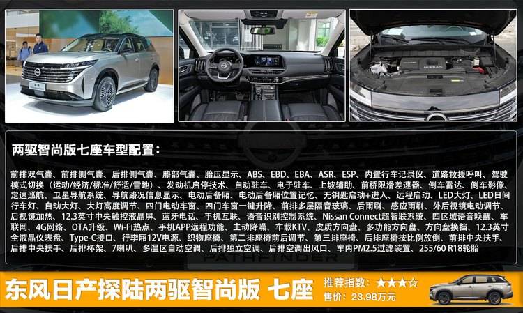 对于探陆而言,它目前共推出了五款车型,其中三款六座车型、两款七座车型。售价为23.98万元的两驱智尚版七座作为全系的入门级车型,它在配置方面配备了前排双气囊、前排侧气囊、后排侧气囊、膝部气囊、胎压显示、ABS、EBD、EBA、ASR、ESP、内置行车记录仪、道路救援呼叫、驾驶模式切换(运动/经济/标准/舒适/雪地)、发动机启停技术、自动驻车、电子驻车、上坡辅助、前桥限滑差速器、倒车雷达、倒车影像、定速巡航、卫星导航系统、导航路况信息显示、电动后备厢、电动后备厢位置记忆、无钥匙启动+进入、远程启动、LED大灯、LED日间行车灯、自动大灯、大灯高度调节、四门电动车窗、四门车窗一键升降、前排多层隔音玻璃、后雨刷、感应雨刷、外后视镜电动调节、后视镜加热、12.3英寸中央触控液晶屏、蓝牙电话、手机互联、语音识别控制系统、Nissan Connect超智联系统、四区域语音唤醒、车联网、4G网络、OTA升级、Wi-Fi热点、手机APP远程功能、主动降噪、车载KTV、皮质方向盘、多功能方向盘、方向盘换挡、12.3英寸全液晶仪表盘、Type-C接口、行李厢12V电源、织物座椅、第二排座椅前后调节、第三排座椅、后排座椅按比例放倒、前排中央扶手、后排中央扶手、后排杯架、7喇叭、多温区自动空调、后排独立空调、后排空调出风口、车内PM2.5过滤装置、255/60 R18轮胎。从配置来看,一款售价在20万元出头的七座中大型SUV,拥有着这样的配置表现,整体来看还是比较实惠的。