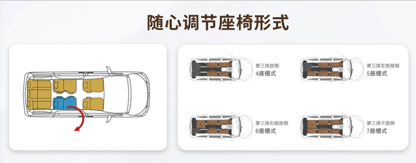 座椅同时也设计了多种分割收叠模式,7座、6座、5座、4座模式之间灵活切换,无论何种出行需求,都有方法满足,为家人释放多样空间。