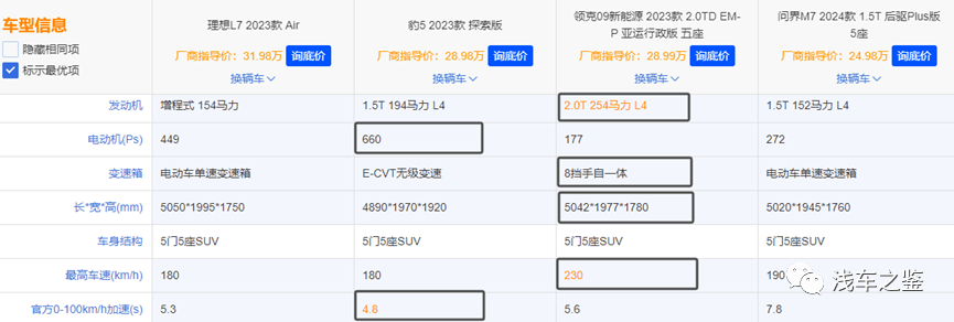 再从动力来说,几款车均搭载涡轮蒸压发动机,除了领克09搭载的是2.0T,最大马力254Ps最优,其余均为1.5T(152-194Ps不等),以及配备的是电动车单速变速箱、E-CVT无级变速、8速手自一体变速箱。理想L7电机总功率330kw,电机总扭矩620N.m。豹5电机总功率485kw,电机总扭矩760N.m。领克09电机总功率130kw,电机总扭矩309N.m。问界M7电机总功率200kw,电机总扭矩360N.m。零百加速依次排开5.3、4.8、5.6、7.8(0-100km/h),豹5最快。而最低荷电状态油耗7.6、7.8、7.8、6.85(L/100km),问界M7最省。理想L7并非优势所在。