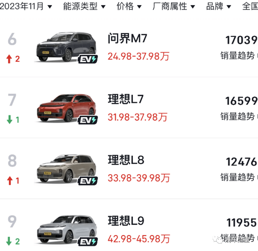 先来看一下几款车型的售价,理想L7共3款车型,售价区间31.98---37.98万元。豹5共3款车型,售价区间28.98---35.28万元。领克09共5款车型,售价区间28.99---34.98万元。问界M7共7款车型,售价区间24.98---32.98万元。从售价来说,也是消费者购买首要要素,手中有多少米决定购买力,问界M7的业绩同样比较喜人,11月达到17039辆,续10月后上浮较大。而豹5、领克09的销量只有区区几百辆,如此悬殊着实看不懂。