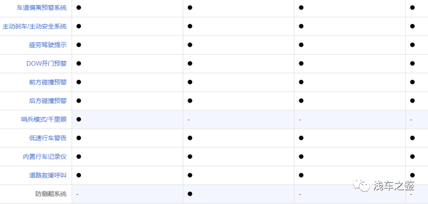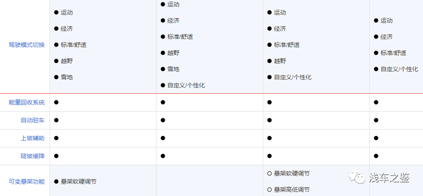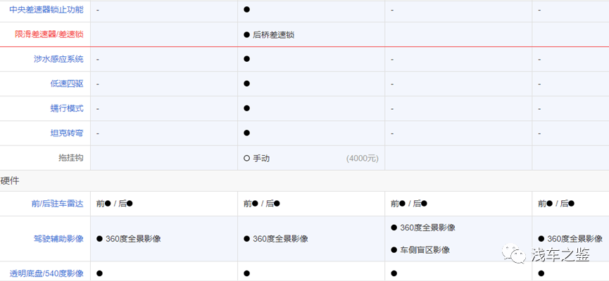从座舱的用料材质方面,以及主被动安全方面,几款车的丰富性几乎无差别,有增有减,其中豹5在四驱越野版块较为突出,配备了中央差速器锁止、后桥差速锁,涉水感应系统,低速四驱,蠕行模式,坦克转弯等。在用料方面,配置方面都是上层品质。