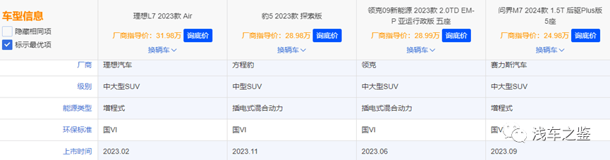 那么,产品力以及配置是衡量售价的标准,几款车型又有什么表现。四款车型中,理想L7和问界M7是增程式动力,豹5和领克09为插电混动,都是混动车型,增程式续航表现相对会多一些,反之,高速油耗会更高,而插电混动更均衡,操控性能也更好,其实完全凭个人喜好和用途选择,以及对品牌的认知。