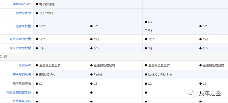 而辅助驾驶方面,几款车均搭载全速自适应巡航,辅助系统有所差异罢了,这就看研发能力和算力,从某平台上不难看出,理想L7多出了地平线征程5的辅助驾驶芯片,算力128TOPS,至于摄像头数量,以及超声波雷达数量和毫米波雷达数,也是半斤对八两差不多。