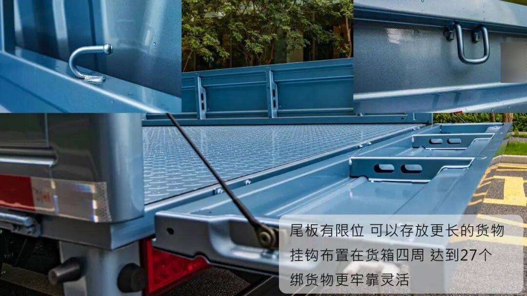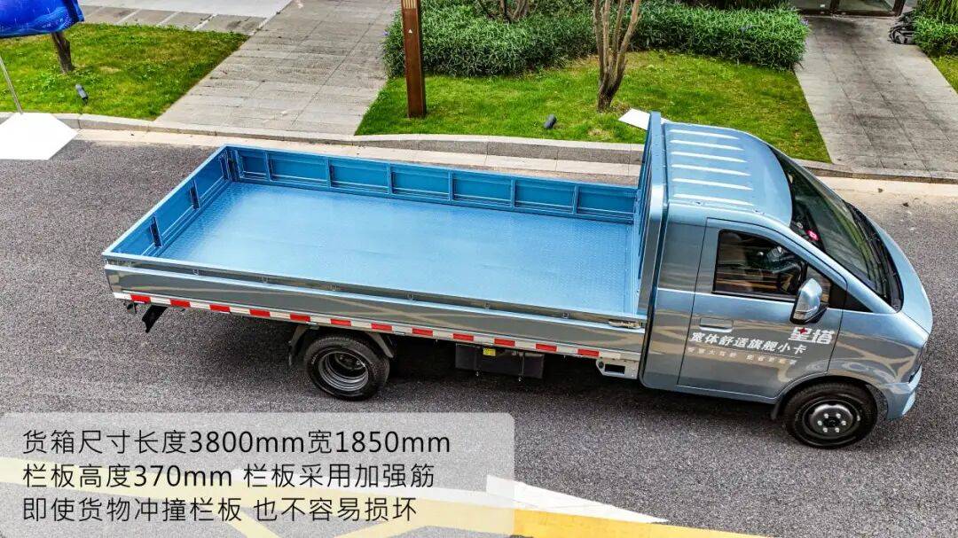 货箱长度3800mm,宽1850mm,栏板高度370mm。超大货箱,能轻松装下1.8米双人床。