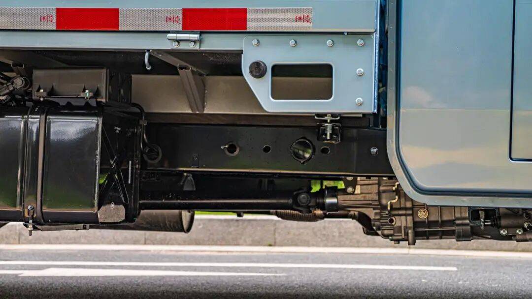 底盘方面,采用高强钢直通式大梁。所用钢材的屈服强度是常用510L钢材的1.5倍。车架上布置9根横梁用于加固,后段车架250mm等效腹高,让底盘可以适应极限重载,同时在紧急碰撞事故时有效保护车身完整,提高安全性。