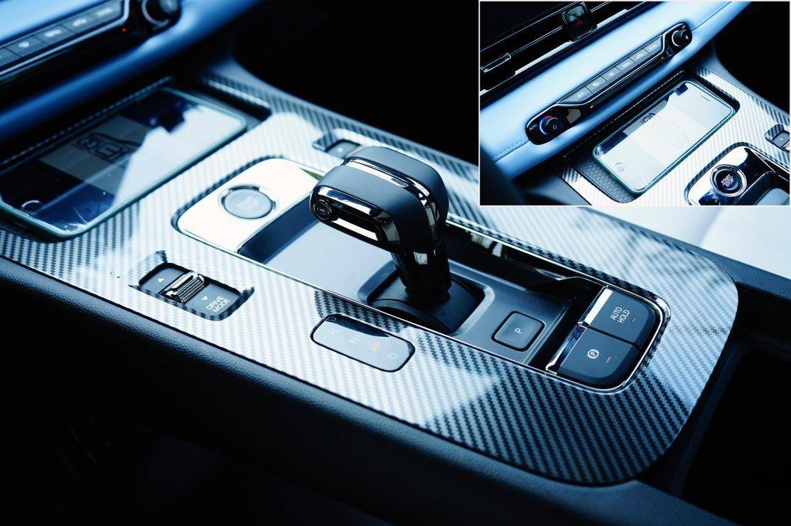 挡杆台采用仿碳纤维面板打底,小尺寸飞行器推杆电子挡杆居中,各种功能按键排布清晰,储物也比较便利。