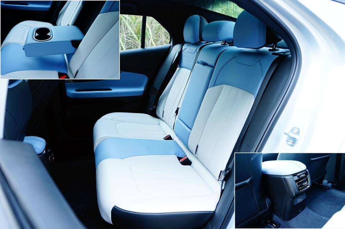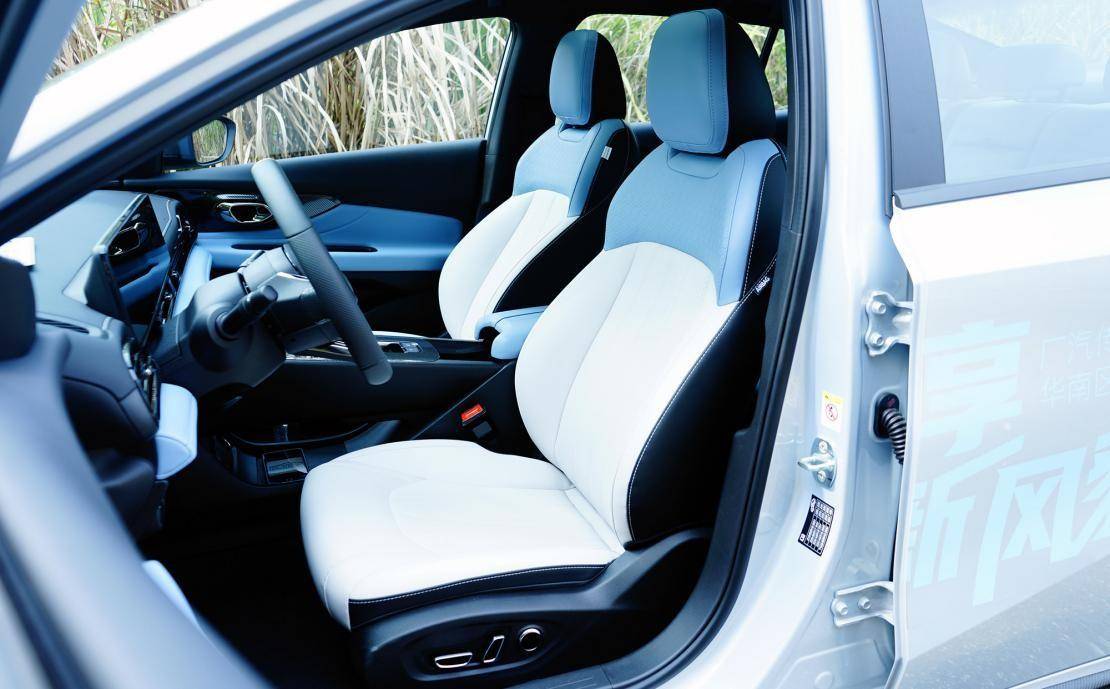 蓝白双色皮面的座椅温馨舒适,填充物饱满,坐垫长度足够,靠背与肩部都有侧向支撑,还提供电动腰撑调节,人体工程做得很成熟。