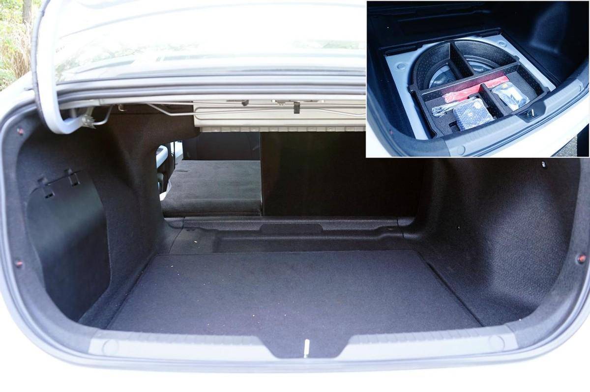 尾厢空间纵深度出色,宽度一般,相比燃油版容积减小了些。后排座椅支持4:6比例放倒,平整度较高。地板下方的备胎也被取消了,提供充气泵和补胎液。