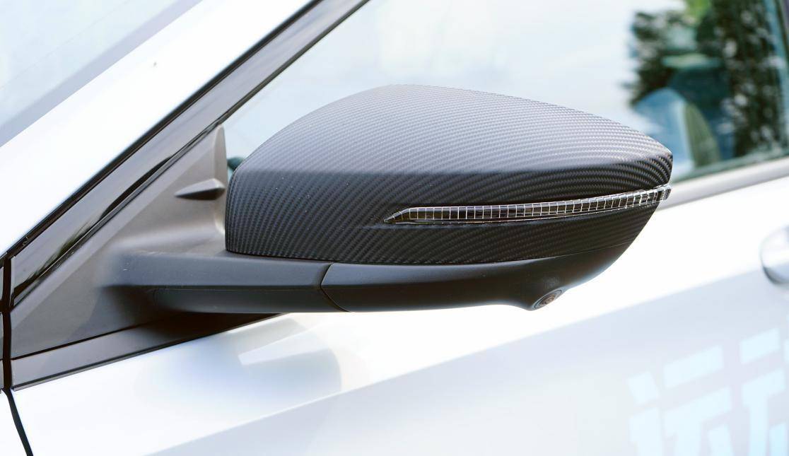 外后视镜造型扁平,采用大面积仿碳纤维材质装饰,细节上很丰富。集成LED侧转灯和侧置摄像头,但摄像头略显突兀。高配车型支持电动调节、电动折叠、记忆、加热、倒车自动下翻和锁车自动折叠。