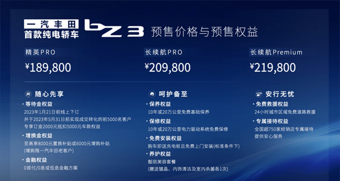 一汽丰田bZ3预售18.98万起,续航最高600km+