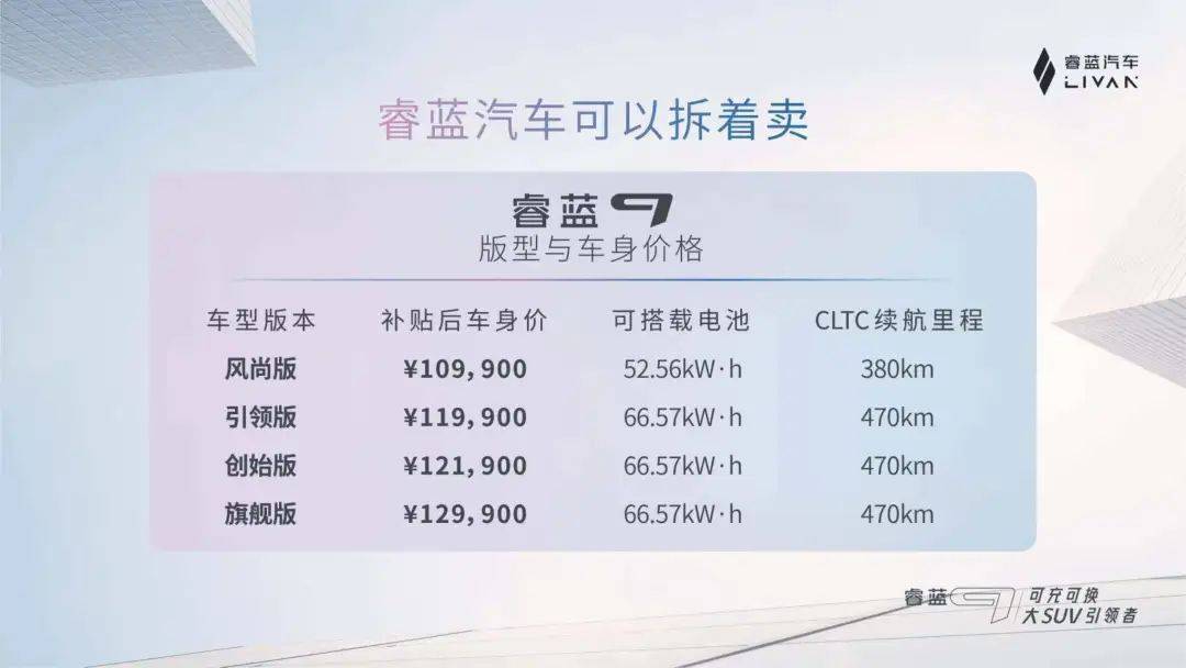 近日,睿蓝9正式上市,共推出4款配置,售价区间为10.99-12.99万元。睿蓝9作为可换电的纯电中型SUV,为用户提供了多种电池使用方案。电池订阅服务:66.57kWh电池包,月租金898元;电池金融服务:电池可以灵活分期,月供低至898元;电池买断方案:66.57kWh电池包买断价7万元,52.56kWh电池包买断价6万元。