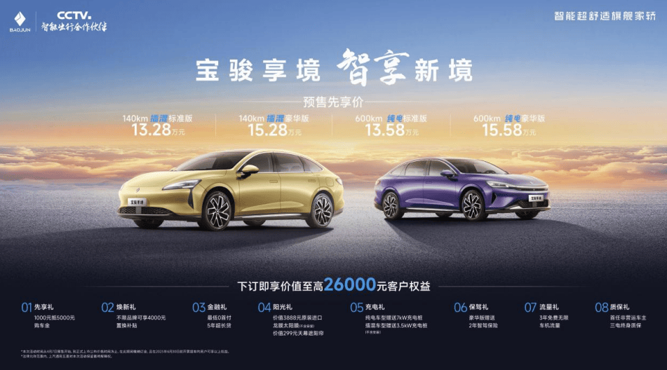 4月7日,2025年上汽通用五菱技术进化日暨宝骏享境预售发布会顺利举行,宝骏汽车首款智能超舒适旗舰家轿宝骏享境正式开启预售,新车提供140km插混标准版、140km插混豪华版、600km纯电标准版、600km纯电豪华版4款车型选择,预售区间为13.28-15.58万元,同时还推出多重购车礼。