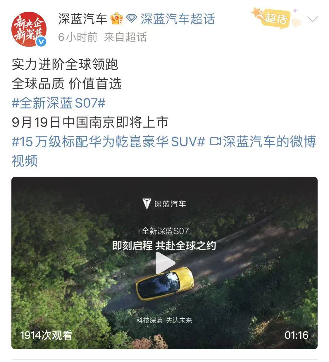 中型SUV/预售价15.69万元起 新款深蓝S07将于9月19日正式上市