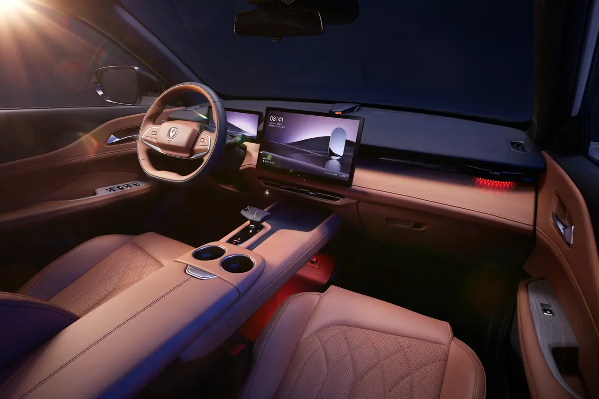 内饰方面,UNI-Z采用一体式环抱座舱设计,中控区域配有大尺寸悬浮屏幕,侧门饰板、扶手箱等位置均采用大面积软性皮质进行包裹,质感和豪华感兼具。