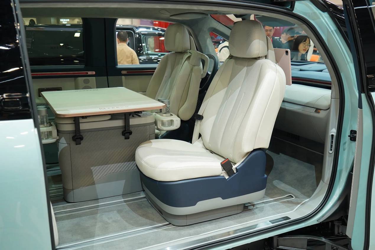 座舱部分,极氪MIX的前排座椅可270度电动旋转,180度旋转后可与后排面对面交谈,配合可移动的岛台和桌板,是不是有“移动的家“那种感觉呢?此外,前排座椅旋转90度,坐着看看风景、钓钓鱼也是很好的应用场景。