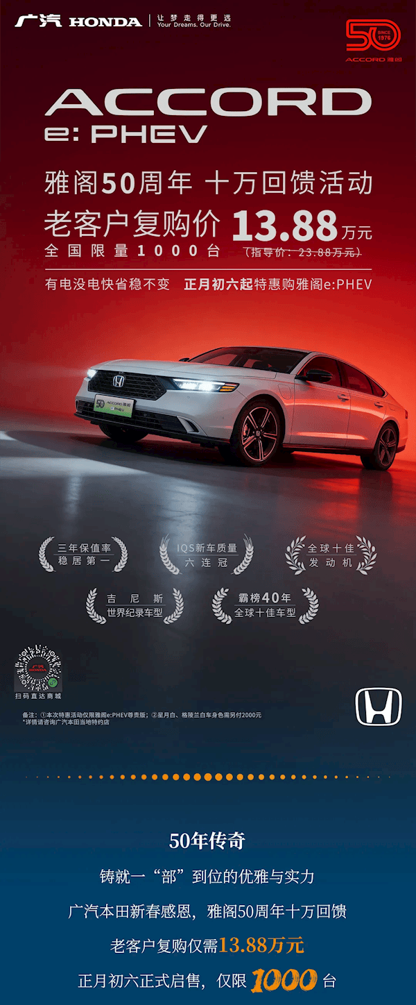 快科技2月22日消息,广汽本田官方今日宣布,为庆祝雅阁50周年,老客户复购雅阁e:PHEV车型,仅需13.88万元,限量1000台。