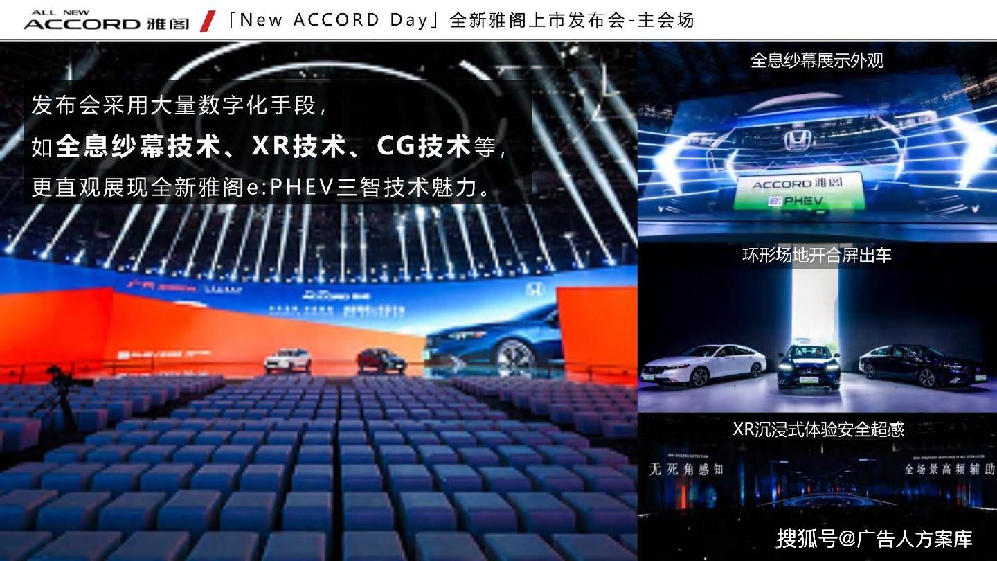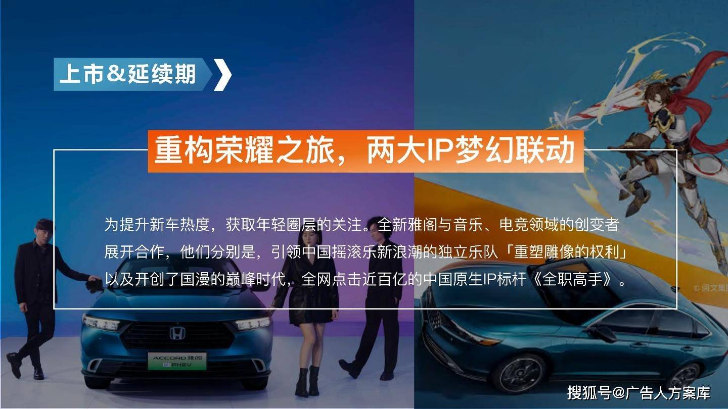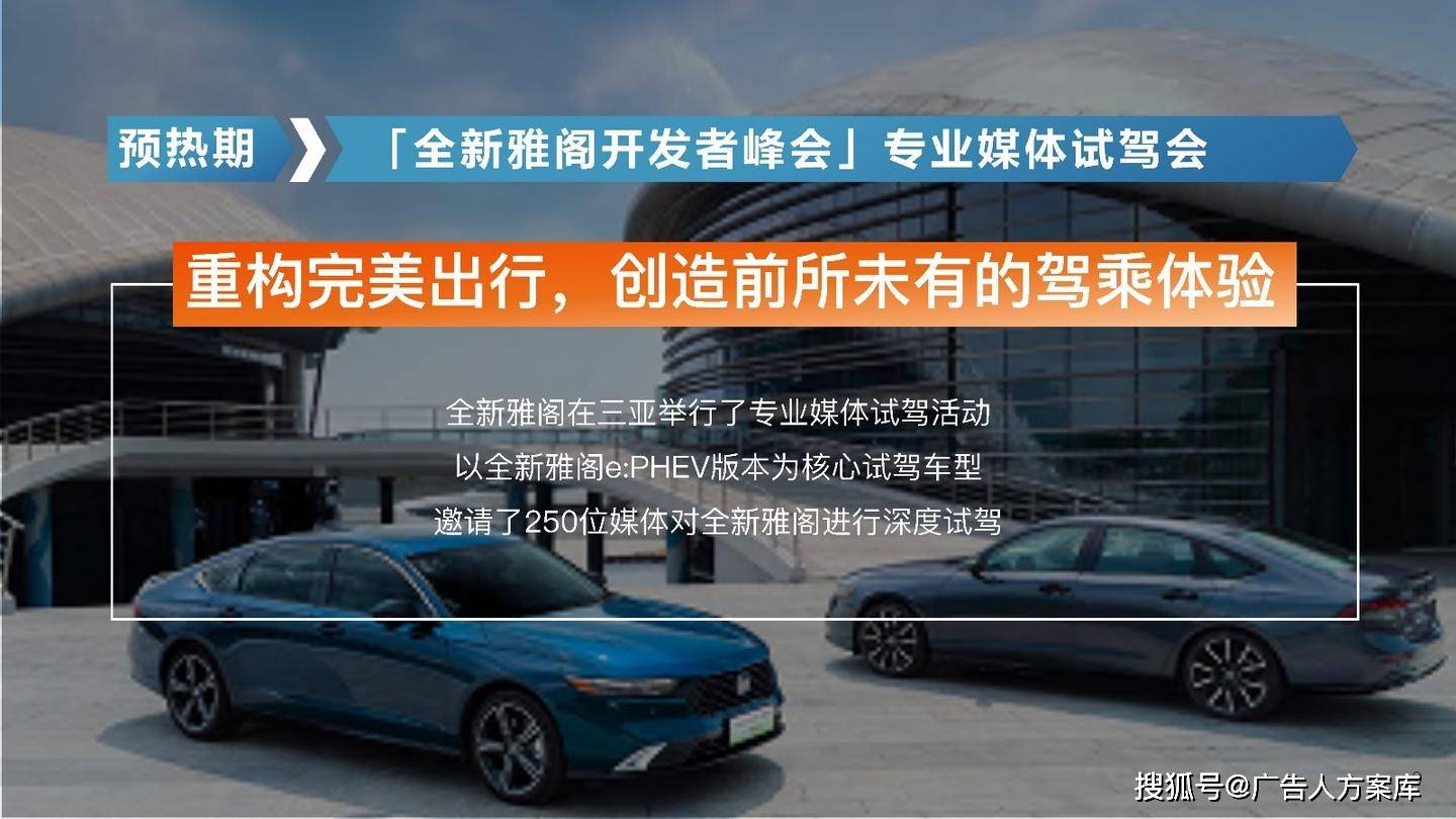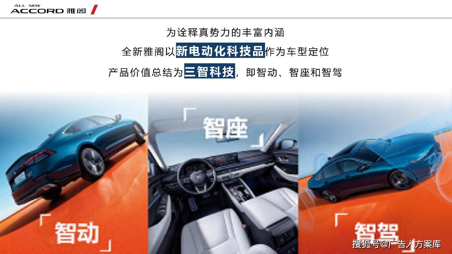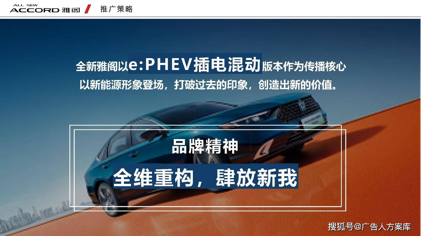 - 目标人群:瞄准高知青年群体,他们追求自我突破和高品质生活,在汽车选择上注重传统性能与智能体验。品牌形象:打破传统与新势力隔阂,提出 “真势力” 概念,以全新雅阁 e:PHEV 为核心,将品牌精神定义为 “全维重构,肆放新我”,重塑品牌形象。