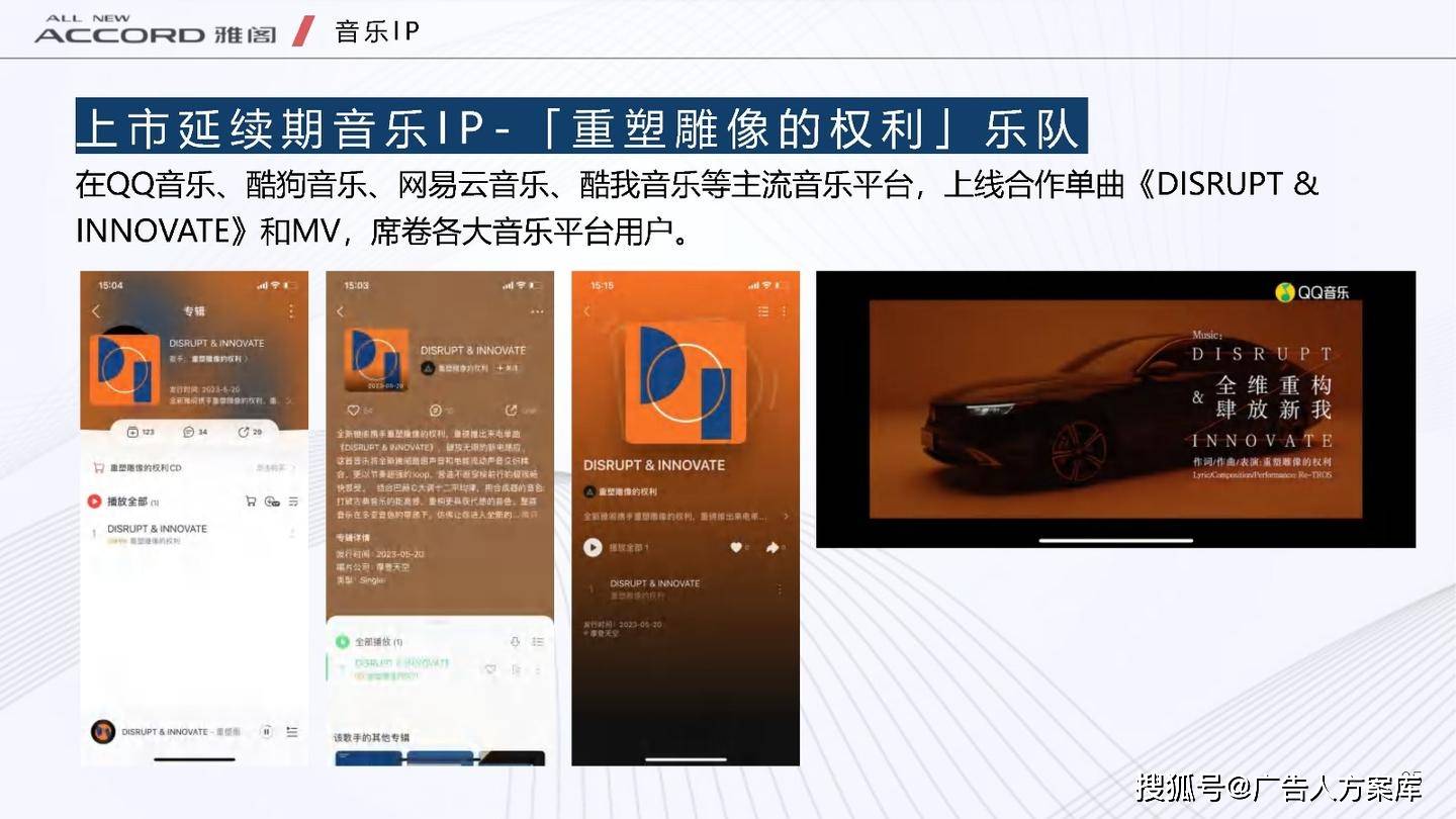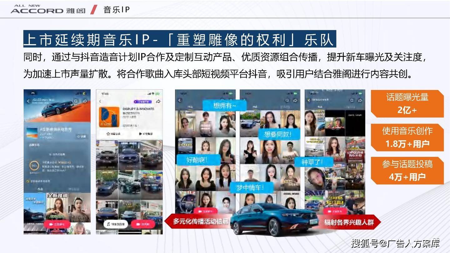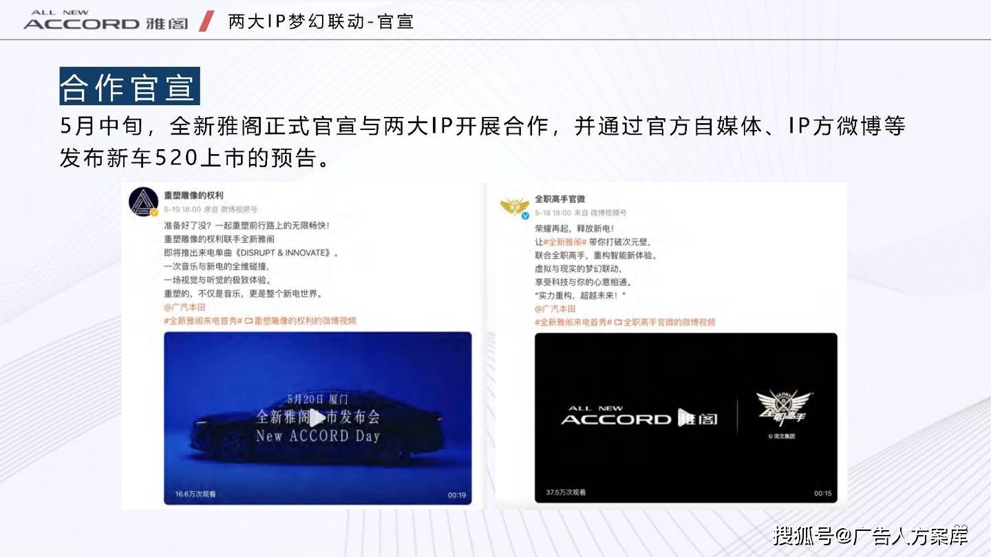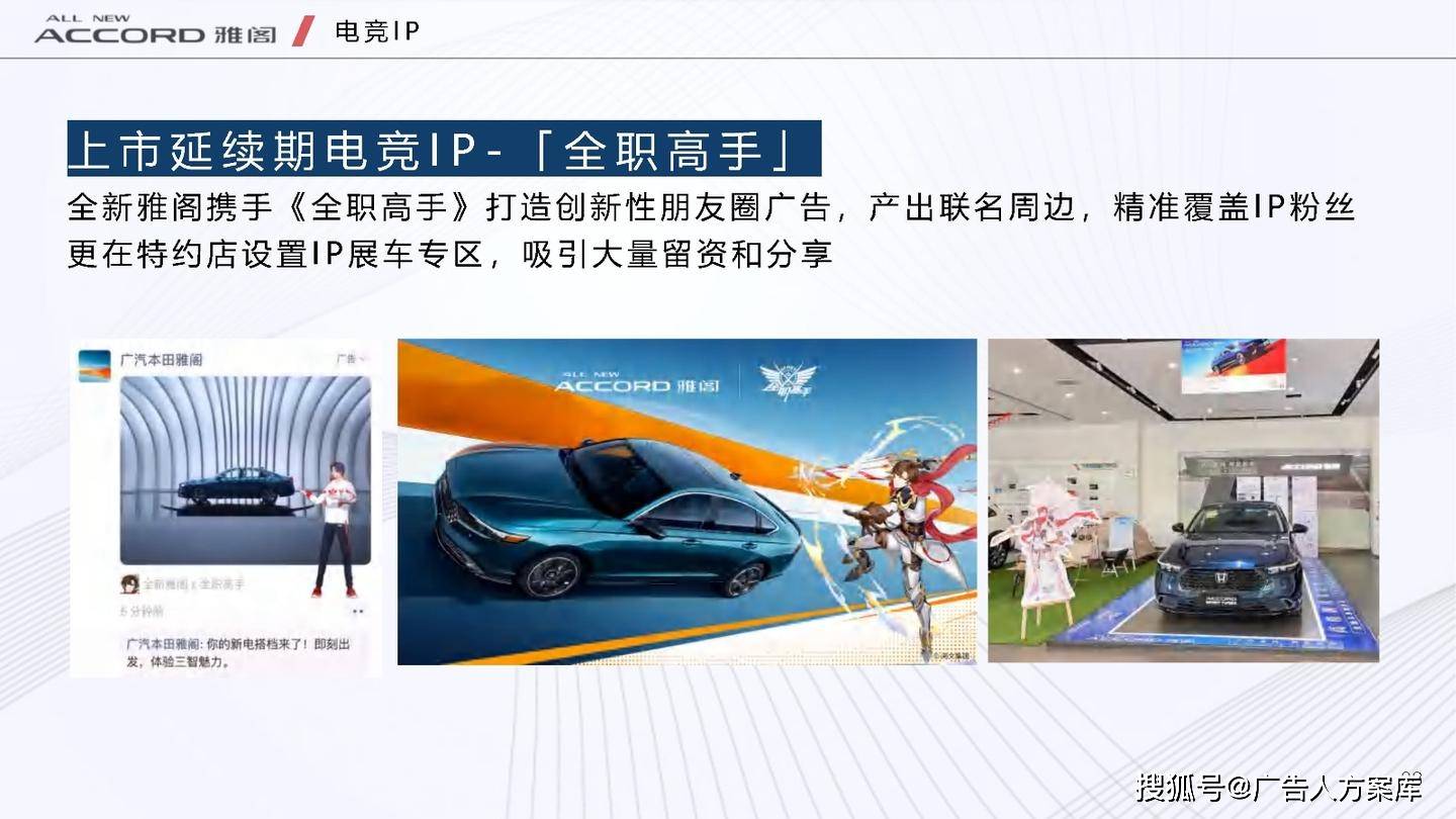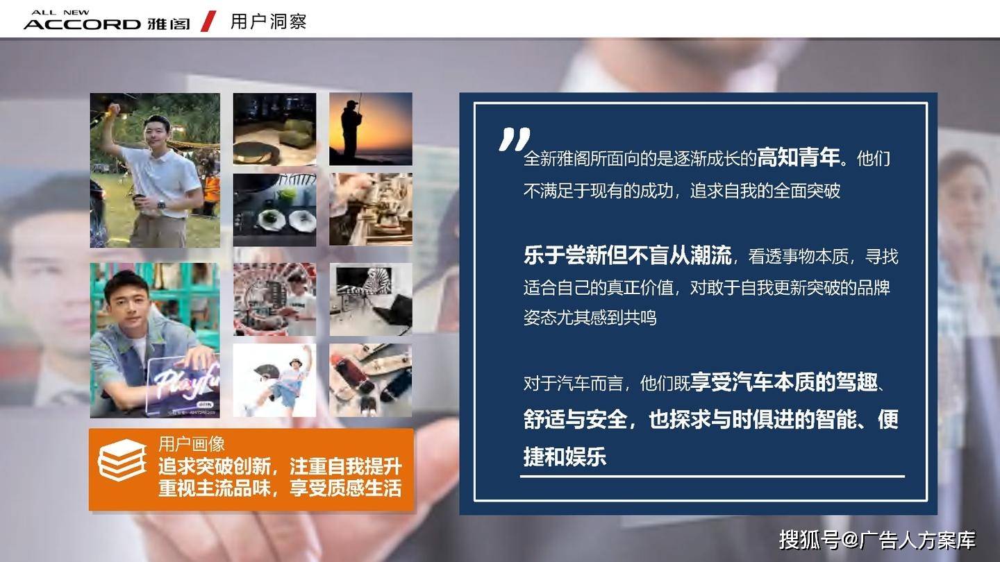 - 目标人群:瞄准高知青年群体,他们追求自我突破和高品质生活,在汽车选择上注重传统性能与智能体验。品牌形象:打破传统与新势力隔阂,提出 “真势力” 概念,以全新雅阁 e:PHEV 为核心,将品牌精神定义为 “全维重构,肆放新我”,重塑品牌形象。