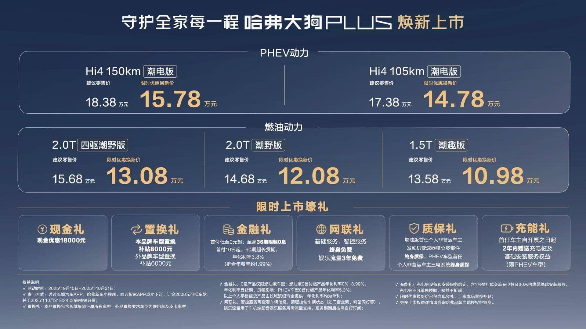 2025年9月15日,哈弗品牌以“守护全家每一程”为主题,隆重举办哈弗大狗PLUS上市发布会,以满满诚意致敬家庭用户。作为行业首款专注家庭需求的泛越野中型SUV,哈弗大狗PLUS真正实现“上市即交付”,诚意推出PHEV版和燃油版两种动力共5款配置车型,限时优惠换新价10.98万元起。