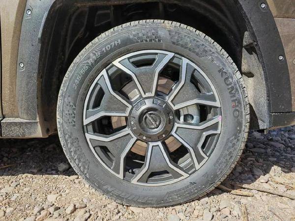 车身线条清晰分明,与传统SUV相比更加流畅,更具动感。车顶行李架和侧裙的黑色塑料护板,使新车在保持时尚感的同时,也彰显出越野的属性。轮胎选的是锦湖Crugen品牌,规格为245/55 R19 107H,胎宽适中,胎璧较厚,搭配双色轮圈造型,更显霸气。而轮眉的包围巧妙地加入了铆钉元素,提升了整车的坚固性和耐用性。