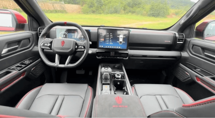 中控台上的12.3英寸全液晶仪表盘和12.1英寸可旋转触控大屏,不仅画质细腻,还集成了大量功能。无论是蓝牙、车载地图,还是车辆控制、驾驶辅助系统调节,以及540°全景影像+透明底盘、水深探测雷达、车辆越野信息等,都能直观操作,科技感满满。