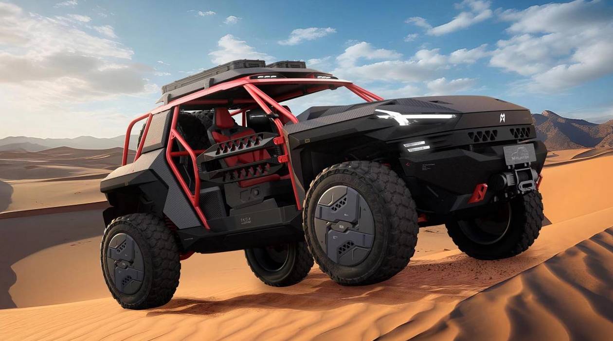 猛士M-HUNTER外观设计非常硬核,没有配备风挡玻璃和完整的车门,车身A、B、C处都采用了骨架结构。前脸和车尾均配有醒目的猛士Logo标志,还配有两个红色的拖车钩以及中置电机绞盘、加宽前后轮眉、车顶 LED 探照灯。