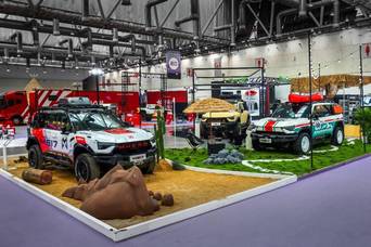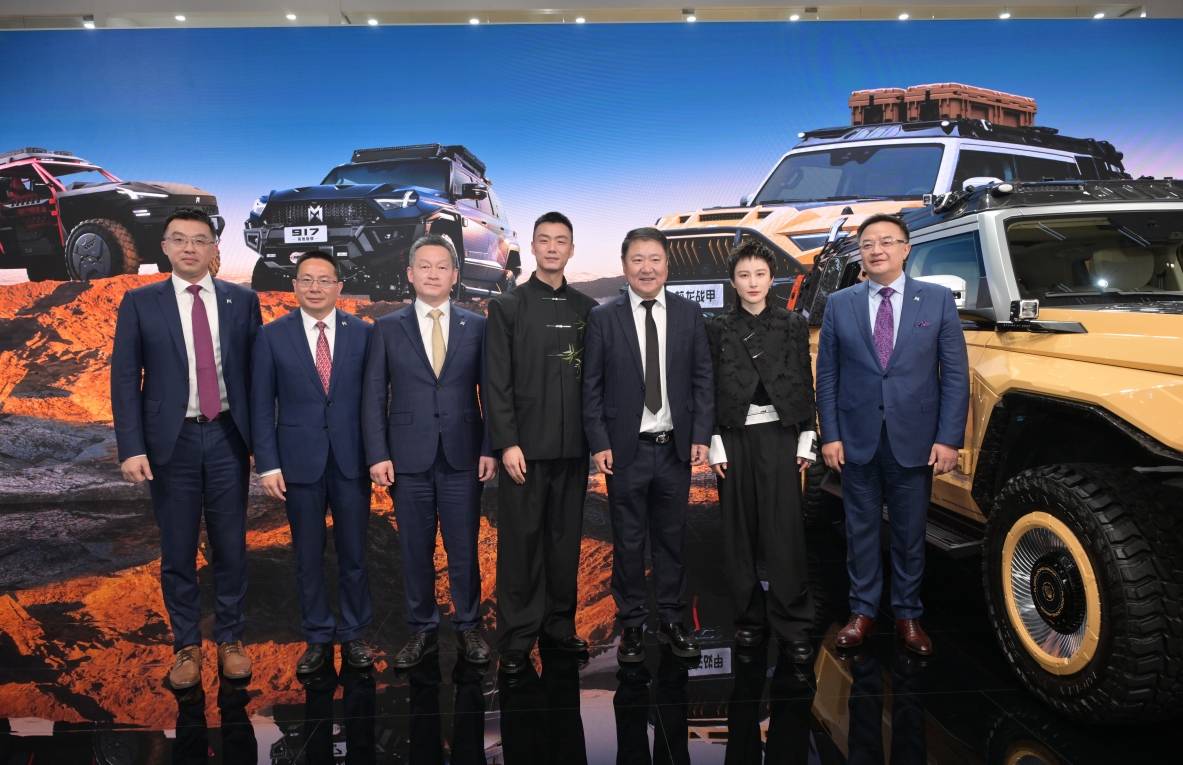 车展期间,猛士科技还与博纳影业宣布达成战略合作,推出首款联名车型—猛士917蛟龙战甲。东风猛士917蛟龙战甲则与电影《蛟龙行动》(原《红海行动 2》)联名。猛士917蛟龙战甲是一款全域机动的豪华电动越野座驾,沿袭了猛士家族“雄魂”设计,将军武风格与中国龙元素相结合,形成“蛟龙战甲”独有的设计创意。沙漠风暴黄军事涂装,搭配银顶撞色,高级感拉满;车辆还搭载直瀑式中网布局、龙牙仿生造型、全封闭式旋翼锻造轮毂等配置。该车采用航空级锻造碳纤维材料制造,关键部位覆盖前后金属保杠前机盖、车顶拓展平台等。