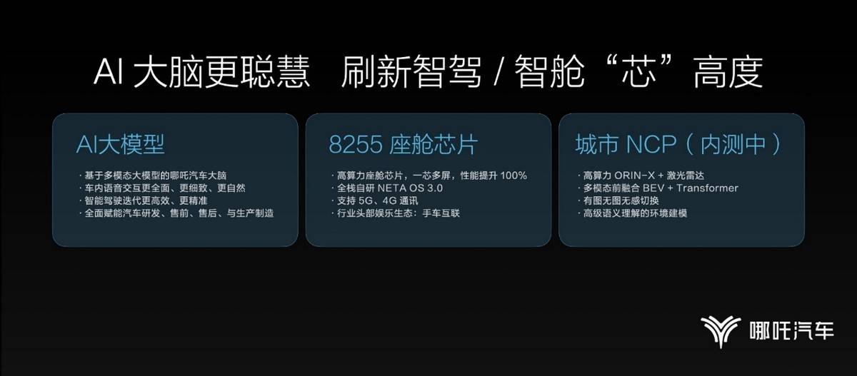 智能化升级,指的是加入了AI通用大模型,搭配高通骁龙8255芯片,可以为用户提供主动服务,同时还能在激光雷达和哪吒自研BEV+Transformer感知算法的加持下,提升哪吒汽车在智能驾驶方面的能力。