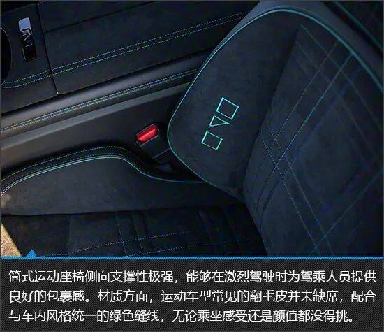 内饰设计同样以“高性能豪华”为核心理念,通过大面积触感细腻的翻毛皮材质以及醒目的绿色缝线勾勒点缀,呈现出豪华感与运动性兼备的座舱氛围。细节之处更见巧思,方向盘顶部增加回正标识,有效强化了操控属性。筒式运动座椅设计合理、内部填充饱满厚实,能够在激烈驾驶时为驾乘人员提供稳固的包裹感与承托性。
