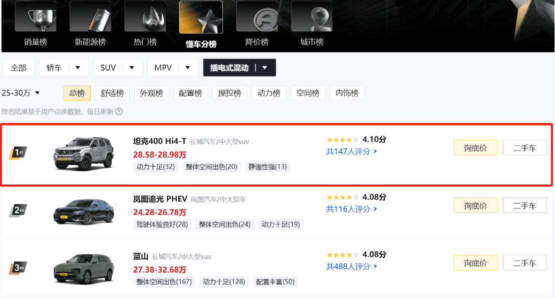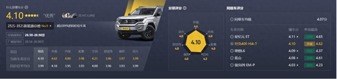 懂车分基于大量真实用户评分计算而来,该项数据显示,坦克400 Hi4-T以4.1的高分霸榜25-30万级所有插混车型榜首,超越89%的同价位车系,足以见得其在车友圈的口碑之高,在众多的用户评价中,坦克400 Hi4-T的越野实力、安全性能及出行经济性也获得了广泛赞誉。