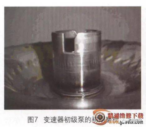 722.9型自动变速器的噪声问题易发生于变速器前部液力变矩器(图6)与变速器初级泵(图7)。导致此类故障发生的原因是液力变矩器或初级泵制造与装配公差造成的。在故障初期,可以感觉到明显噪声。到了后期,有可能导致液力变矩器或初级泵的严重机械失效。