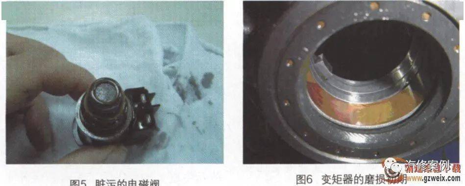 变速器控制单元设有8个控制油路的电磁阀(图4),这些电磁阀由于自身故障或因为油品问题,都有可能造成电磁阀工作故障。一般情况下,如果电磁阀出现故障,可以通过故障诊断仪检测到相应的故障码。在配件条件允许的情况下,更换失效的电磁阀,或者更换变速器控制单元即可解决问题。如果是因为油路脏的问题造成的电磁阀工作故障(图5),在清洁变速器内部后即可解决问题。