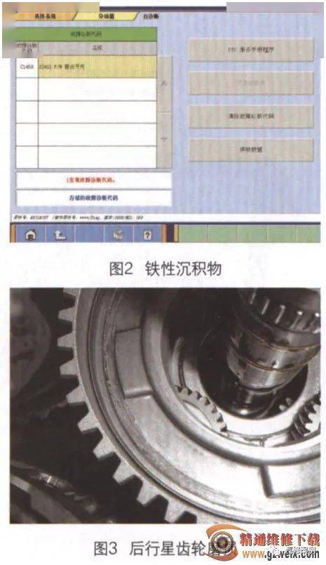 先要进行变速器外观检查,查看是否有外表损伤或者漏油现象。如果没有损伤,需要使用诊断仪进行检测。如果出现故障码0741/0893/0894/2502/2504/2505/2511/2711/27831且拆检油底壳后发现大量铁性沉积物(图2),则很有可能是变速器液力变矩器的锁止离合器或变速器的后行星齿轮出现磨损(图3)。此时,变速器已经磨损,只能更换整个变速器并且清洗油路。