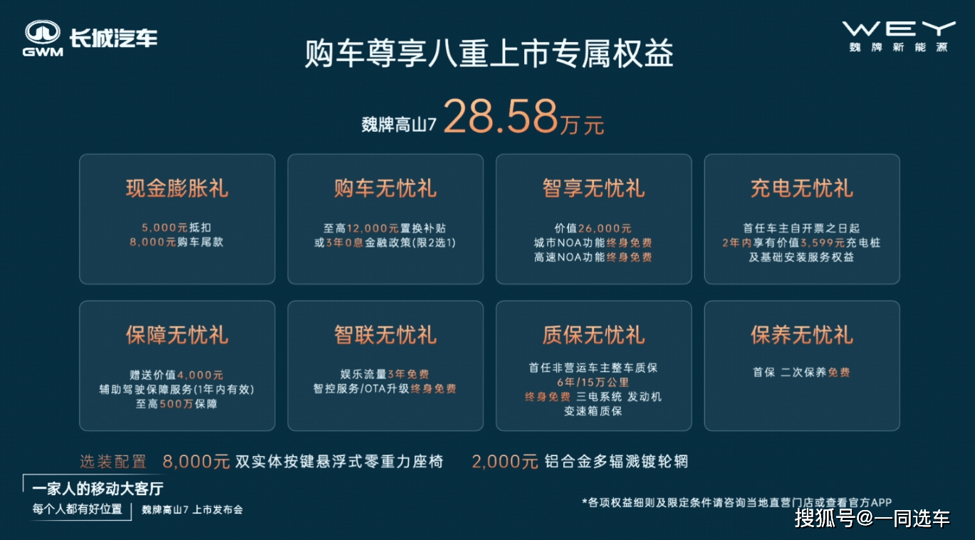 10月15日,魏牌高山7正式上市,售价:28.58万元,且终身免费三电系统、发动机、变速箱质保。