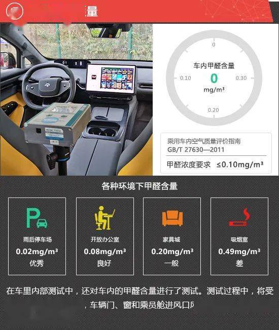 在车内空气质量测试环节,将车辆放置在车辆较少的内部地面停车场中,实测2023款昊铂GT的车内未检测出甲醛成分,完全符合2012年3月1日起实施的,由原环保部和国家质量监督检验检疫总局联合发布的《乘用车内空气质量评价指南》(中华人民共和国国家标准GB/T 27630-2011)中的相关标准。