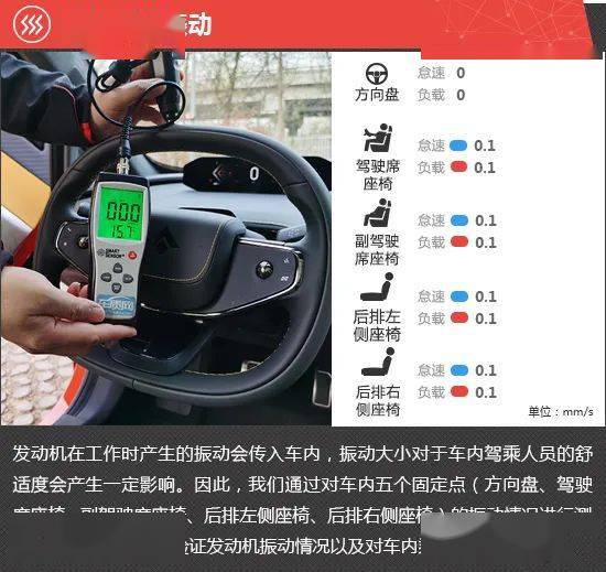 在静态车内振动测试环节,怠速和负载两种状态下,2023款昊铂GT方向盘处的振动数值始终为0,前、后排座椅的振动数值也处于较低水平且保持不变,体感均不明显。