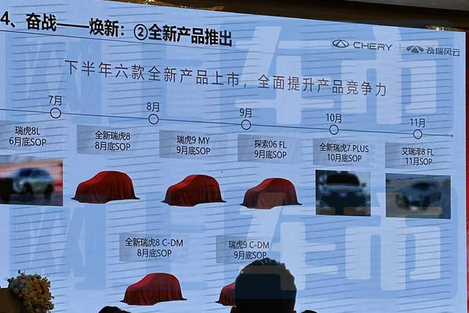 网上车市了解到,奇瑞品牌2024年下半年将推出6款燃油车型,包含瑞虎8 L、全新瑞虎8、瑞虎9中期改款、探索06中期改款、全新瑞虎7 PLUS及艾瑞泽8中期改款。此外还有2款混动产品全新瑞虎8 C-DM、瑞虎9 C-DM,共计8款新产品。