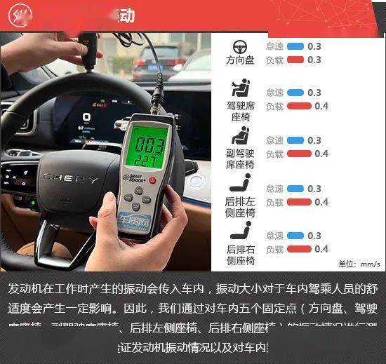 在静态车内振动测试环节,方向盘和前/后排座椅在怠速状态下的测试数值均为0.3mm/s。在负载状态下,前/后排座椅的振动数值略有上升,均为0.4mm/s,而方向盘处的振动数值不变,依旧为0.3mm/s。对于车内乘坐舒适性的影响较小。
