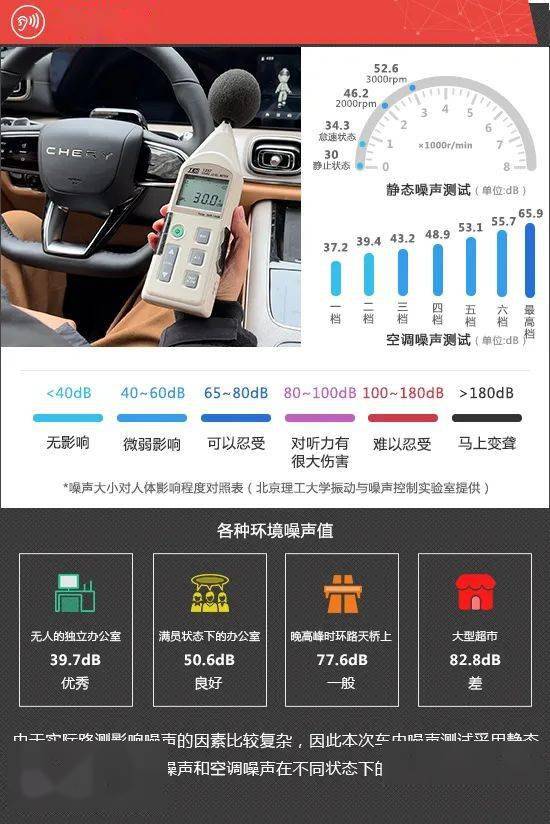 在静态噪声测试环节,2023款奇瑞瑞虎9在静止状态对车外噪音隔绝出色,车内实测噪声值已经达到了测试仪器最低值30dB。随着发动机启动,传入车内的噪声值呈现出逐渐增大的趋势,从测试数据也能看出,发动机在怠速、2000转和3000转时,传入车内的噪声值分别为34.3dB、46.2dB和52.6dB。通过与几种不同环境下噪声值对比来看,2023款奇瑞瑞虎9对于发动机噪音抑制表现较好,工作状态下不会对车内驾乘人员造成干扰。