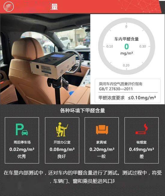 在车内空气质量测试环节,将车辆放置在车辆较少的内部地面停车场中,实测车内未检测出甲醛,符合2012年3月1日起实施的,由原环保部和国家质量监督检验检疫总局联合发布的《乘用车内空气质量评价指南》(中华人民共和国国家标准GB/T 27630-2011)中的相关标准。