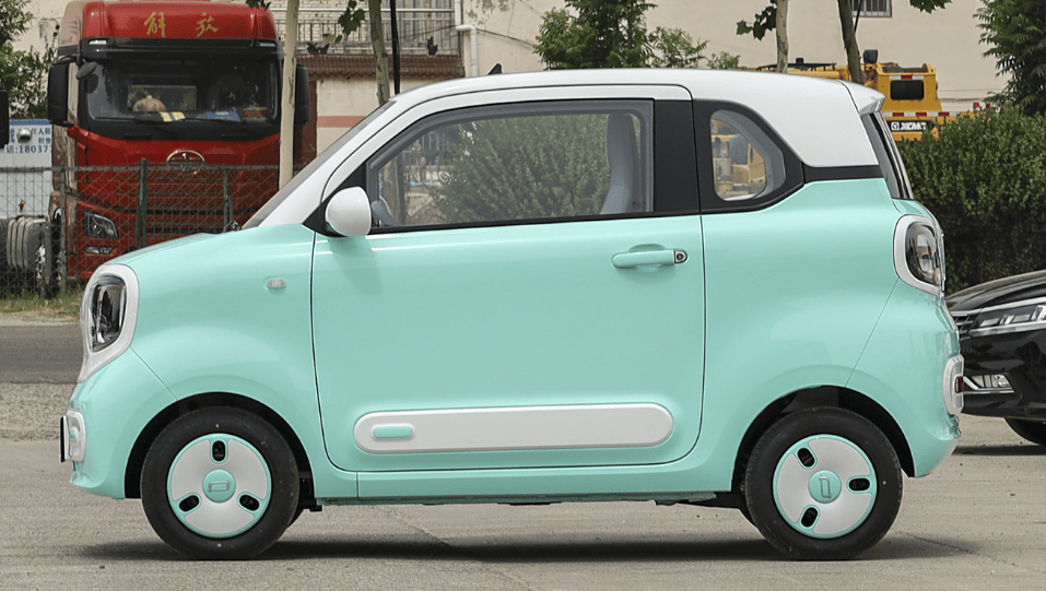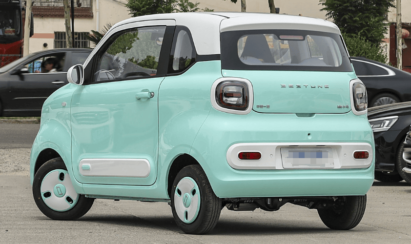 从侧面看,这车更特别了,单侧开门,而且就只有一个车门,这种设计虽然少见,但真的让这车显得挺独特的。还有啊,钢制的轮毂也是降低成本的一个小细节。车尾设计也是简洁明了,不过好在还有个倒车雷达,开车的时候能多一份方便。