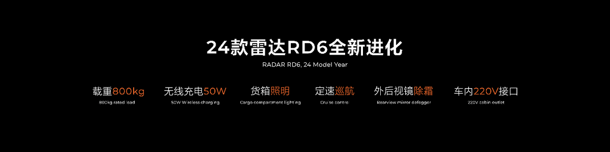 最后是2024款雷达RD6的上市,其最大的升级,就是载重能力由原来的450公斤增加到了800公斤,车内新增了50w无线充电功能和220V接口,实现全车用电自由,并配置了定速巡航。