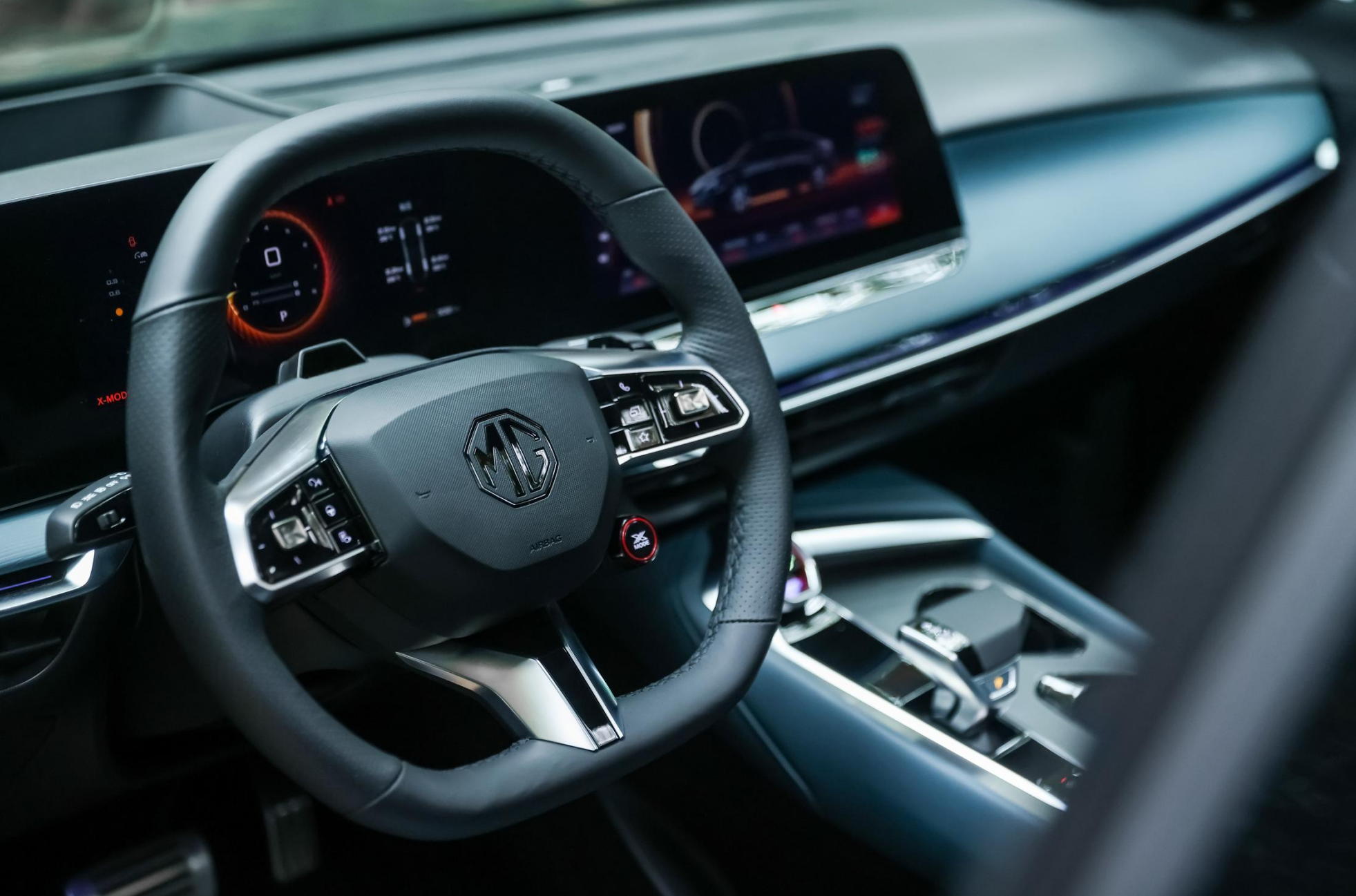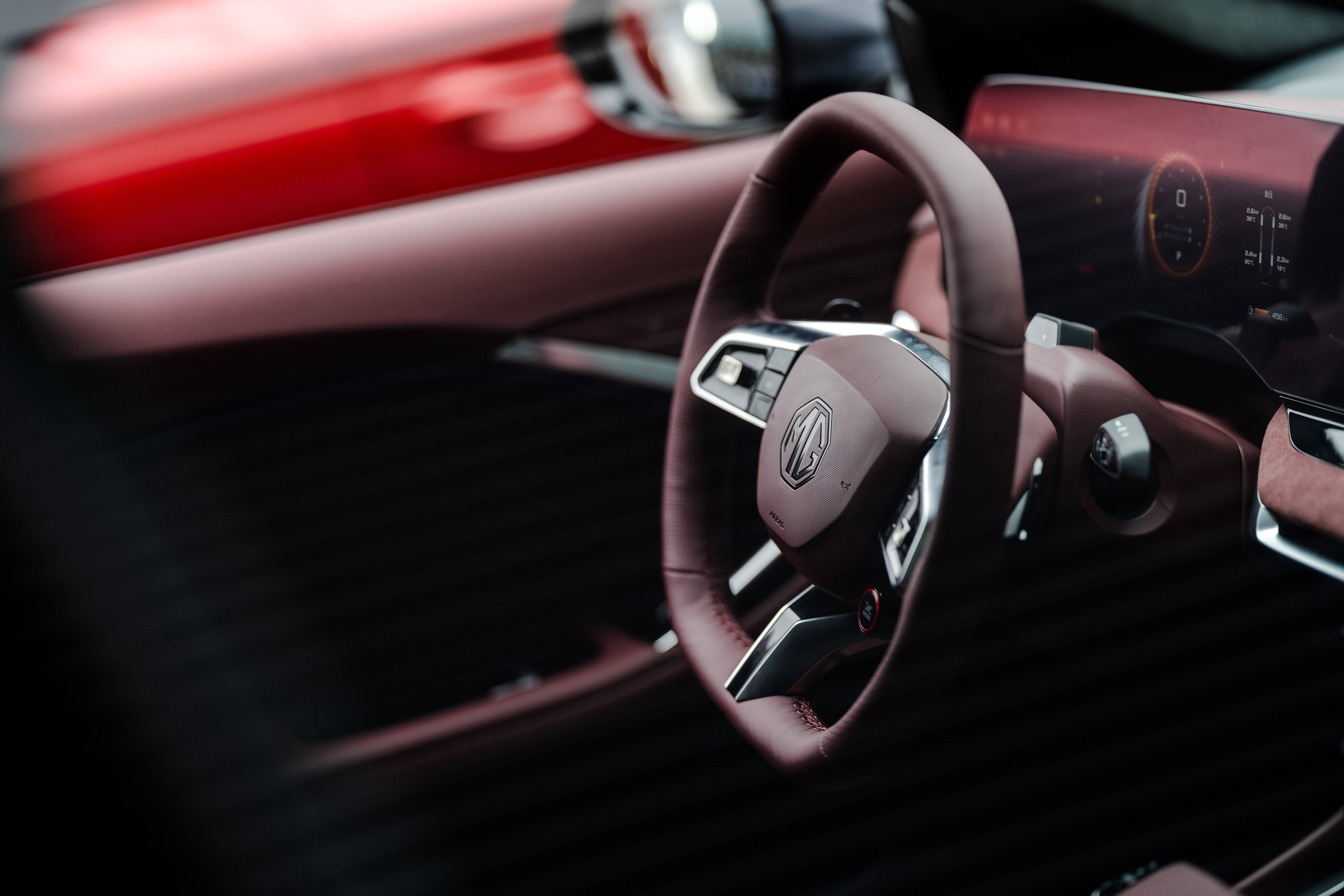 为了让MG7表里如一,座舱内使用大量Dinamica®材质包覆,平底式方向盘上不仅单独设计了一枚红色X-Mode按键,还配备有换挡拨片,而一键启动按键也与跑车同款,加之暴风眼一体式赛车运动座椅,速度激情感呼之欲出。值得好评的是,33英寸一体式双联屏左侧触控屏还内置了功能切换选项,下方也保留了一排触控按键,诠释着百年进化的实用主义。
