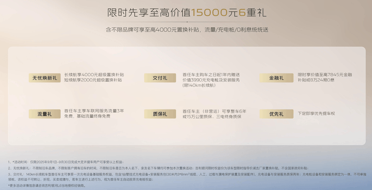 先说说性价比,吉利银河L6 EM-i给出的价格门槛尤为亮眼,目前限时权益价7.78万元起,还可叠加至高15000元的6重好礼,这是用入门级价格就能享受越级配置。