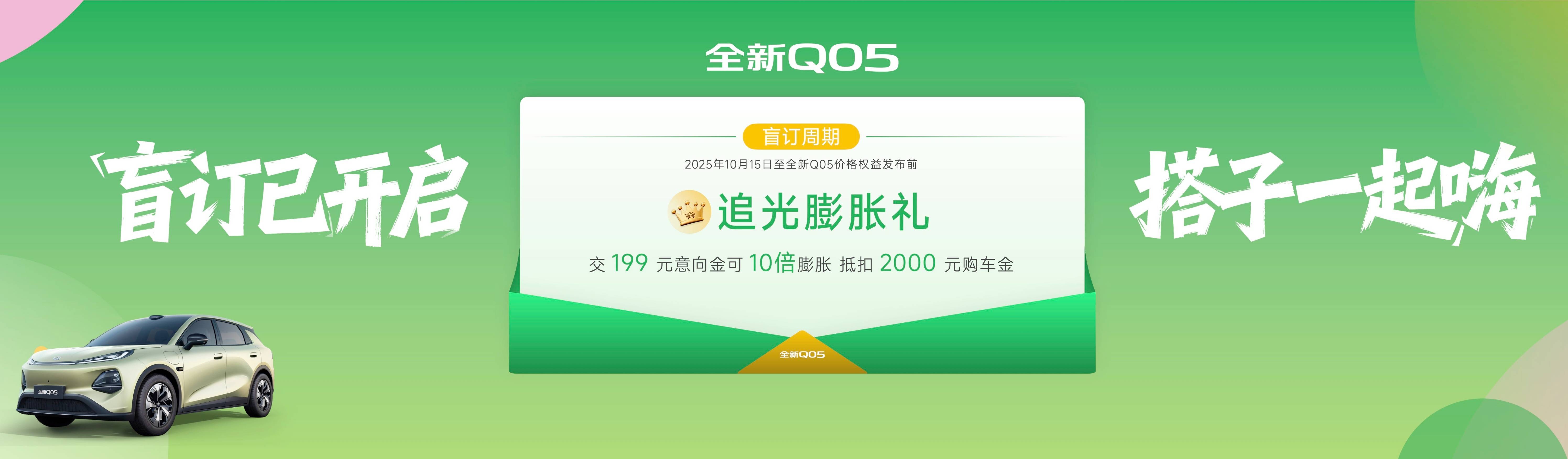 10月15日,长安启源全新Q05正式亮相首秀并开启盲订,即日起至新车价格权益发布前,消费者下订即享“追光膨胀礼”:交199元意向金,可10倍膨胀抵扣2000元购车金。同时,新车也将会陆续抵达全国各门店。