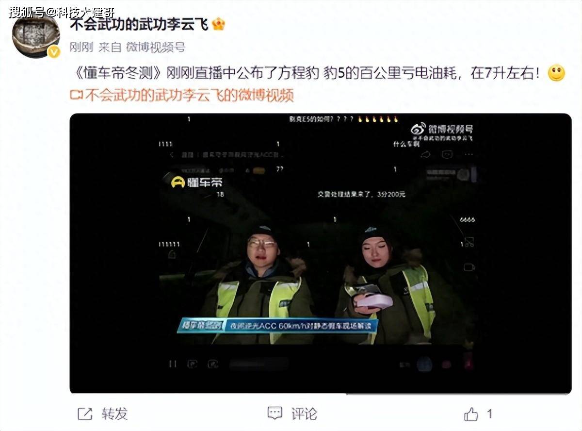比亚迪公关部总经理李云飞发布了《懂车帝冬测》视频片段,视频中直播公布了方程豹豹5的百公里亏电油耗,在7升左右。
