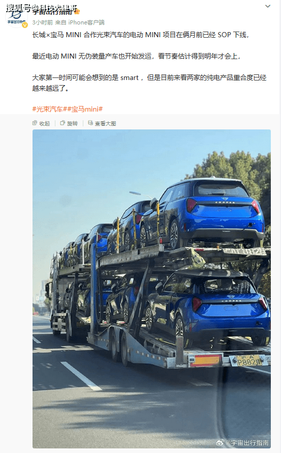 据微博博主透露,长城与宝马合作的首款车型—电动MINI的量产车型已经开始运输。