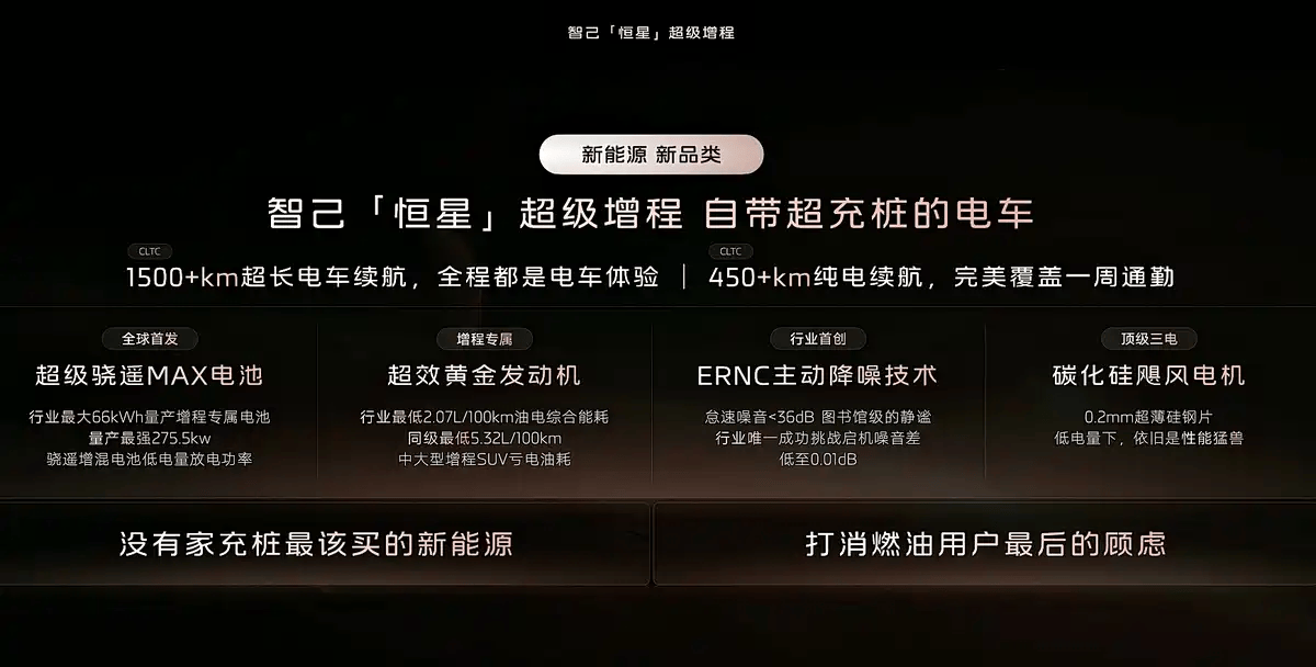 关于这个动力,这是一台“恒星”超级增程系统,该系统由1.5T发动机与电动机组成,搭配66kWh电池组,纯电续航超450km,综合续航超1500km。至于两个数据,估计是工况不一样导致的。