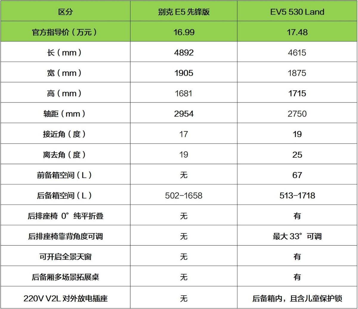 所以在我看来,车内乘坐空间是先锋版别克E5最大也是唯一的优势了,注意是车内乘坐空间,装载空间可比不上Land版起亚EV5,同时Land版起亚EV5独有的后备厢多场景,相信是非常吸引大家的一个配置。这里还想说明一点,别克E5作为一款纯电动SUV,原厂都没有给到充电口外放电功能,更别提220V的车内V2L对外放电插座功能了。那么回到开头,别克E5对比起亚EV5,17万左右预算你会怎么选呢?